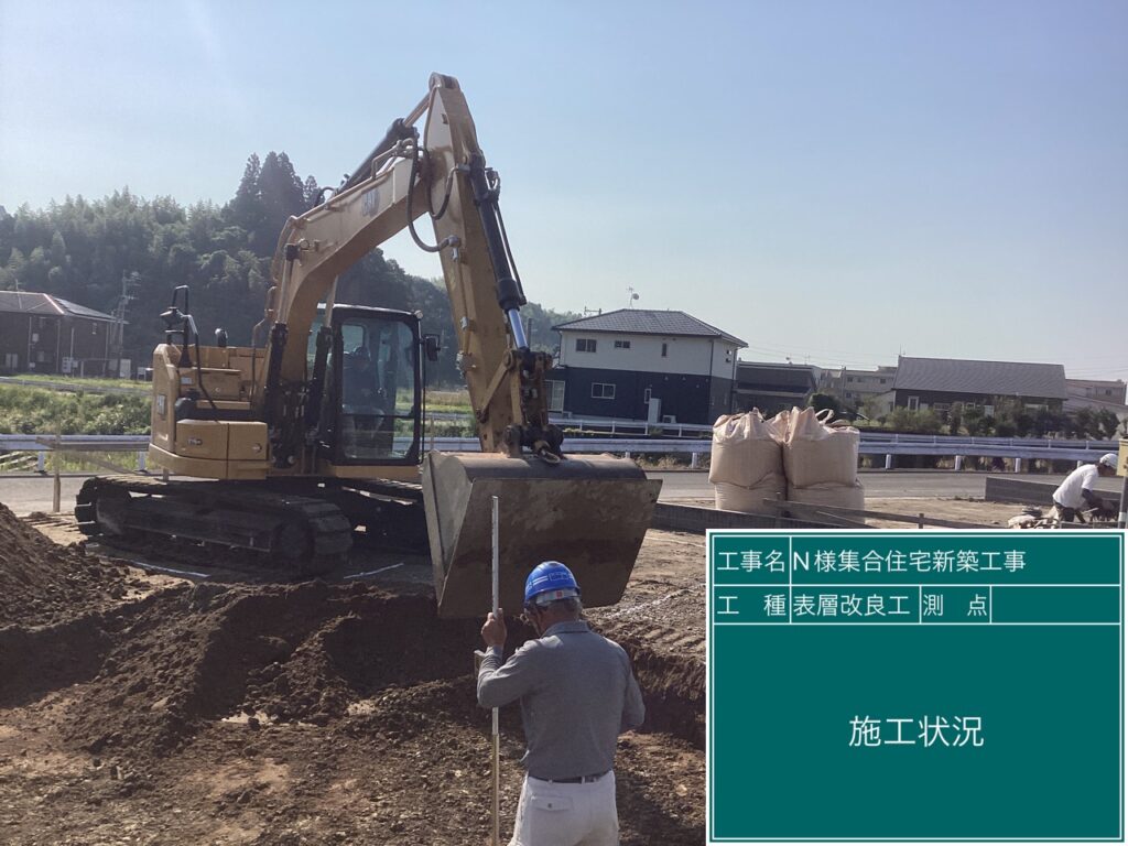 表層改良工事 先週末よりセメント固化剤による集合住宅の基礎工事で 表層改良工事をしています。
