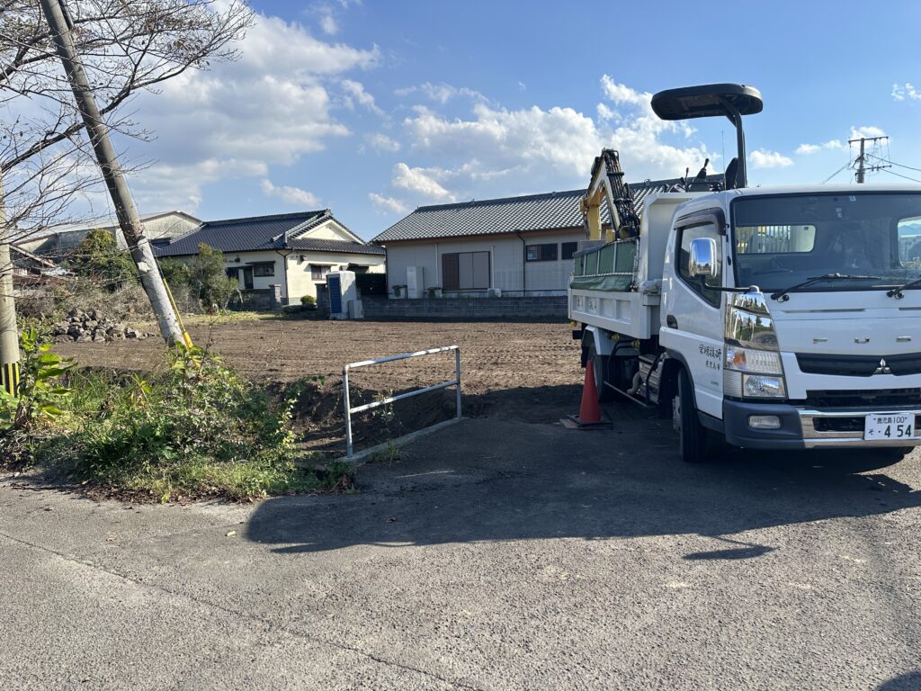 出水市の造成工事はひと段落して、本体の基礎工事に着手しました。本体工事の中で弊社は表層改良工事を担当します👷